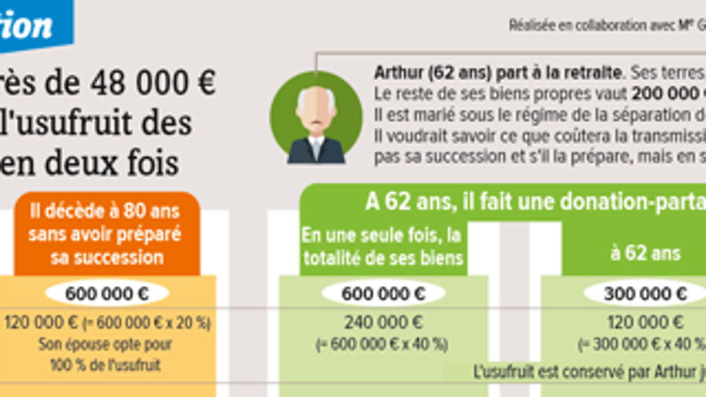 Lorsqu’une personne consent une donation en pleine propriété, elle perd immédiatement tout droit sur les biens transmis. Or l’allongement de la durée de vie et la faiblesse des retraites agricoles nécessitent de conserver quelques ressources. Transmettre de son vivant la seule nue-propriété du bien permet de conserver son usage (par exemple l’habiter) ou les revenus qu’il procure (par exemple, le fermage). En se réservant ainsi l’usufruit du bien donné, les droits de donation sont calculés sur la seule valeur de la nue-propriété, qui dépend de l’âge de l’usufruitier (voir barème de l’usufruit). « Malheureusement, je constate trop souvent que le fermage n’est payé par le nu-propriétaire. Cela peut générer des problèmes par la suite si les enfants ont un contrôle fiscal et qu’ils passent quand même le fermage en charge », met en garde le notaire.