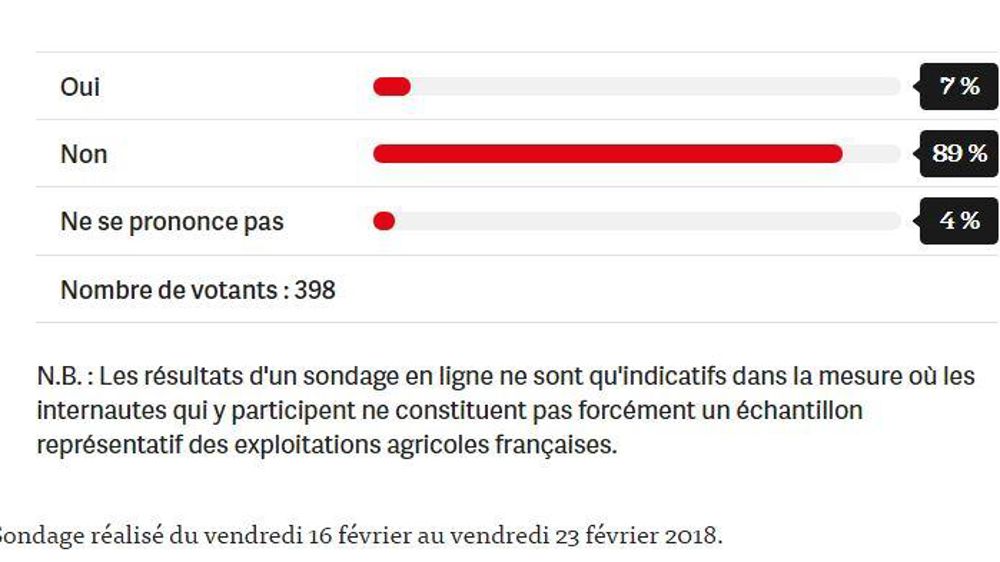 N.B. : Les résultats d’un sondage en ligne ne sont qu’indicatifs dans la mesure où les internautes qui y participent ne constituent pas forcément un échantillon représentatif des exploitations agricoles françaises.