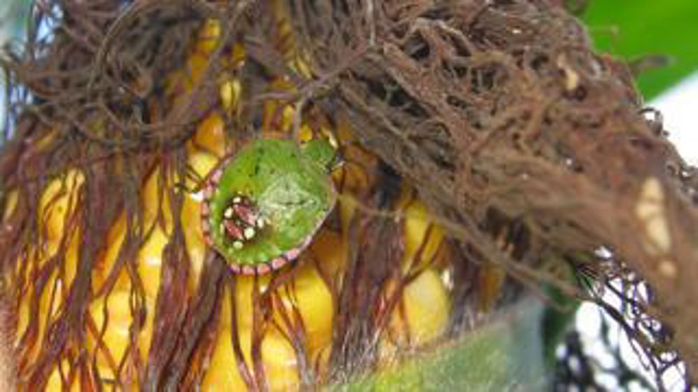 «Très fréquente depuis deux ans en Alsace, la punaise verte se fait particulièrement remarquer cette année en se développant de manière exponentielle sur maïs, soja et tournesol, » indiquent Arvalis et Terres Inovia.