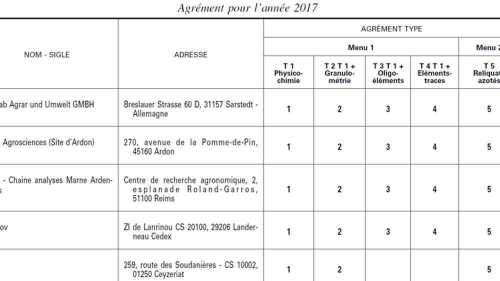 La liste des laboratoires bénéficiant d’un agrément pour faire des analyses de terre est parue au Journal officiel du 17 février. Sur les 28 laboratoires agréés, 12 ont un agrément pour toutes les analyses (physicochimie, granulométrie, oligoéléments, éléments traces et reliquats azotés).