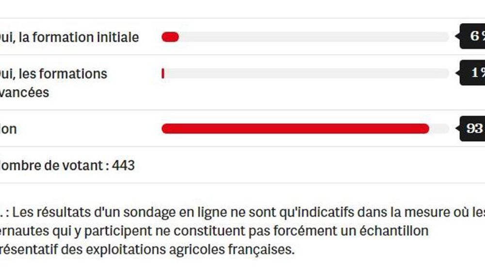 N.B. : Les résultats d’un sondage en ligne ne sont qu’indicatifs dans la mesure où les internautes qui y participent ne constituent pas forcément un échantillon représentatif des exploitations agricoles françaises.