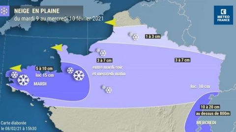 C’est dans la matinée qu’une perturbation va « aborder la pointe bretonne. Au contact de l’air froid, les précipitations sont tombées sous forme de neige », précise Météo-France. Le vent de Nord-Est soutenu favorisera le risque de congères.