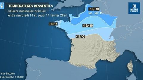 Températures ressenties minimales entre le mercredi 10 et le jeudi 11 février 2021. © Météo-France