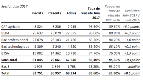 Il est à noter la belle envolée du CAP agricole, qui dépasse cette année les 95 % de réussite (+6,2 points). Cette augmentation rattrape la légère baisse constatée en bac pro et BTSA par rapport à la session d’examens de juin 2016 : respectivement –1 et –1,3 point. Les Bepa et bac techno restent, quant à eux, stables (+0,1 point).