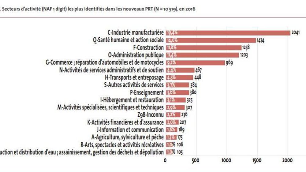 Les professions les plus exposées aux maladies sont l’industrie manufacturière (19 %), les métiers de la santé humaine et de l’action sociale (14 %), la construction (12 %), le commerce et réparation d’automobiles et des motocycles (9 %) et l’administration publique (11 %). L’agriculture, la sylviculture et la pêche recensent 175 cas.