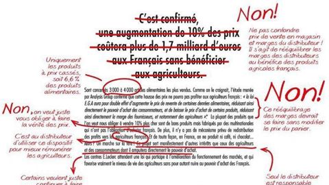 Le message est signé Leclerc et constitue une nouvelle charge du distributeur contre le projet de loi Alimentation actuellement en discussion au Parlement. En particulier contre la mesure visant à relever de 10 % le seuil de revente à perte (SRP), afin de rééquilibrer les marges des distributeurs, selon les vœux du ministère de l’Agriculture.