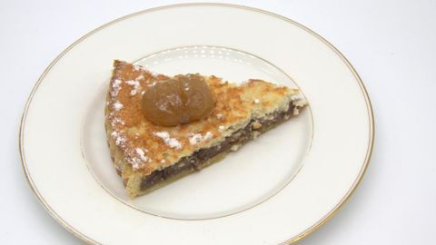 Dessert ardéchois par excellence, la tarte de Michel se compose d’un fond de pâte brisée, tartinée de crème de châtaigne, recouverte d’une meringue, et couronnée de brisures… de châtaignes (Retrouvez sa recette ici).