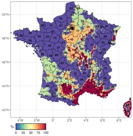 À l’échelle de la France, le risque phytosanitaire présente des disparités régionales. Les zones climatiquement favorables selon les 3 modèles utilisés par l’Anses (en rouge sur la carte ci-dessus) sont situées dans le sud du pays, notamment sur les côtes méditerranéennes (Occitanie, Provence-Alpes-Côte d’Azur, Corse) ainsi que dans le Tarn et Tarn-et-Garonne. D’autres zones favorables, plus localisées, se rencontrent dans la région Centre-Val de Loire et Bourgogne-Franche-Comté.
