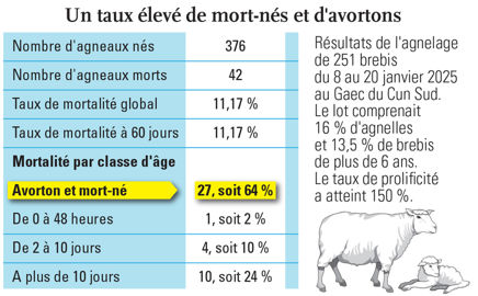 La première étape consiste à récapituler le plus précisément possible l’ensemble des résultats obtenus avec les pratiques mises en œuvre lors de la dernière mise bas. La mortalité, par exemple, est enregistrée par classe d’âge (avorton et mort-né, de 0 à 48 h, de 2 à 10 jours et de plus de 10 jours). « Si le taux de mortalité global, au Gaec du Cun Sud, à 11,7 % est plutôt bon car la moyenne des élevages français se situe entre 15 et 17 %, les agneaux mort-nés représentent 64 % des pertes », observe Marion Guibert.
