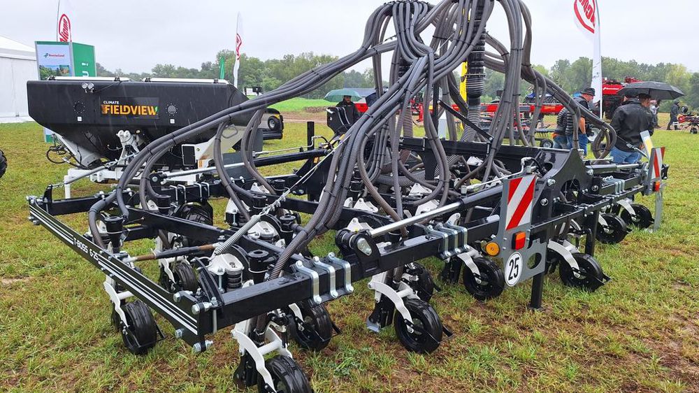 Le T-Boss est en fait une rampe de semis, car l’appareil est dépourvu de trémie. Les éléments semeurs sont installés sur quatre rangées et l’écartement entre les rangs est proposé de 18,75 à 25 cm. L’implantation est assurée par des pointes de 12 mm de largeur, en carbure de tungstène. Toutes disposent de deux tubes de descente. Ils sont réglables individuellement afin de positionner à différentes profondeurs la semence et le second produit. Plusieurs socs seront disponibles, dont un modèle pour diffuser en bande. À l’arrière des dents, une roue en forme de W referme le sillon. Pour assurer le suivi du sol, chaque élément est monté indépendamment sur parallélogramme à pression pneumatique. Le réglage de la profondeur est assuré par le système Easydepth.
