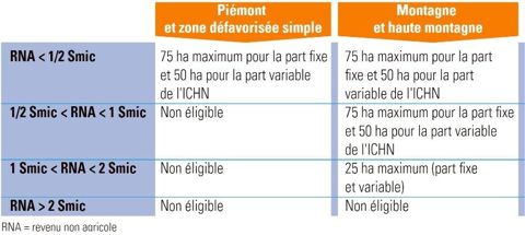 L’indemnité compensatoire de handicaps naturels (ICHN) a pour objectif de compenser financièrement le manque à gagner des agriculteurs actifs des zones défavorisées. Pour la percevoir intégralement, il faut tirer au moins 50 % de ses revenus de l’activité agricole. Si l’exploitant possède une autre source de revenus non agricole (1) (autre emploi salarié ou non salarié non agricole), l’ICHN est réduite, voire nulle, selon le niveau de ces revenus extérieurs (voir le tableau ci-après).