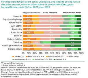 À l’inverse 71 % des exploitations viticoles voient le montant de leurs aides progresser « de manière significative » (d’au moins 30 %) et 54 % des fermes en maraîchage et horticulture.