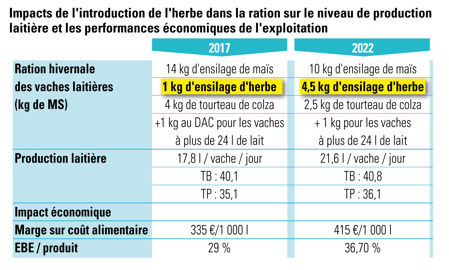 En réduisant l’utilisation des concentrés, la marge sur coût alimentaire est passée de 335 € / 1 000 l il y a 5 ans, à 415 €. La nouvelle ration a également permis d’améliorer le niveau de production de l’exploitation, passant de 17,8 l de moyenne par vache laitière en 2017 à 21,6 l en 2022.