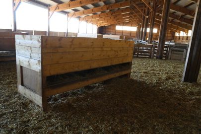 « Nous avons dû concevoir un râtelier de toutes pièces puisqu’il n’en existait pas dans le commerce, poursuit l'éleveur. J’ai installé un “aileron” dans la trémie pour réguler la descente du fourrage. » Le râtelier mesure 3 m de longueur sur 1 m de largeur et 1,2 m de hauteur. Il nourrit 60 brebis pendant 2 jours. Pour les brebis en lactation, la ration comprend désormais de la paille (150 kg), du foin moyen (260 kg), du sainfoin (280 kg), du foin de regain (260 kg), de la luzerne (300 kg), du tourteau de soja (40 kg), du tourteau de colza (40 kg), du triticale (170 kg), de la mélasse (75 kg) et un complément minéral vitaminé (CMV) (10 kg).