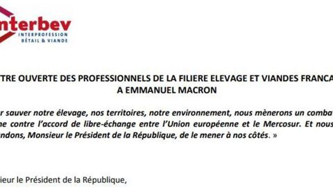 Dans une lettre ouverte adressée à Emmanuel Macron, l’interprofession du bétail et de la viande fait appel au soutien présidentiel dans son combat contre la libéralisation des échanges avec le Mercosu (...)
