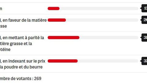 Presque neuf internautes sur dix ayant répondu à notre sondage souhaitent que la grille de paiement du lait soir revue. Vous êtes 20 % à vouloir donner plus d’importance à la matière grasse dans le ca (...)