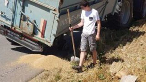 La moisson bat son plein, avec son lot d’imprévus. L’un perd le pneu de sa benne sur la route, l’autre se retrouve nez à nez avec des sangliers. Un petit garçon regarde le bon déroulement de la récolt (...)