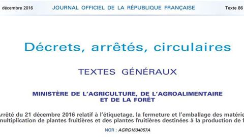 L’arrêté du 21 décembre 2016 précise les modalités d’étiquetage, la fermeture et l’emballage des matériels de multiplication de plantes fruitières et des plantes fruitières destinées à la production d (...)