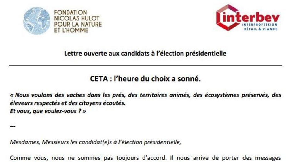 « Nous voulons des vaches dans les prés, des territoires animés, des écosystèmes préservés, des éleveurs respectés et des citoyens écoutés. Et vous, que voulez-vous ? » C’est avec ces mots que les deux organismes interpellent les candidats. À cette lettre sont joints les résultats de l’étude d’impact sur l’accord de libre-échange entre l’Union européenne et le Canada (Ceta) commandée par le groupe Verts/ALE du Parlement européen et Interbev.