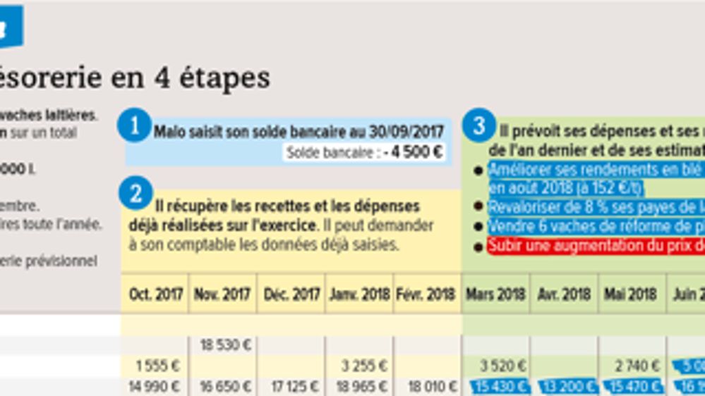 Réaliser un budget de trésorerie consiste à évaluer les dépenses et les recettes de l’année à venir. Il ne faut pas oublier de tenir compte des prélèvements privés. « L’idéal est de faire une prévision mois par mois, explique Pierre Lucas, responsable du pôle économie agricole à Cogedis, pour être au plus proche de la situation bancaire. » Souvent, la simulation est calée sur la même période que l’exercice comptable. « Je conseille de s’appuyer sur le grand livre pour retrouver les opérations mois par mois. »