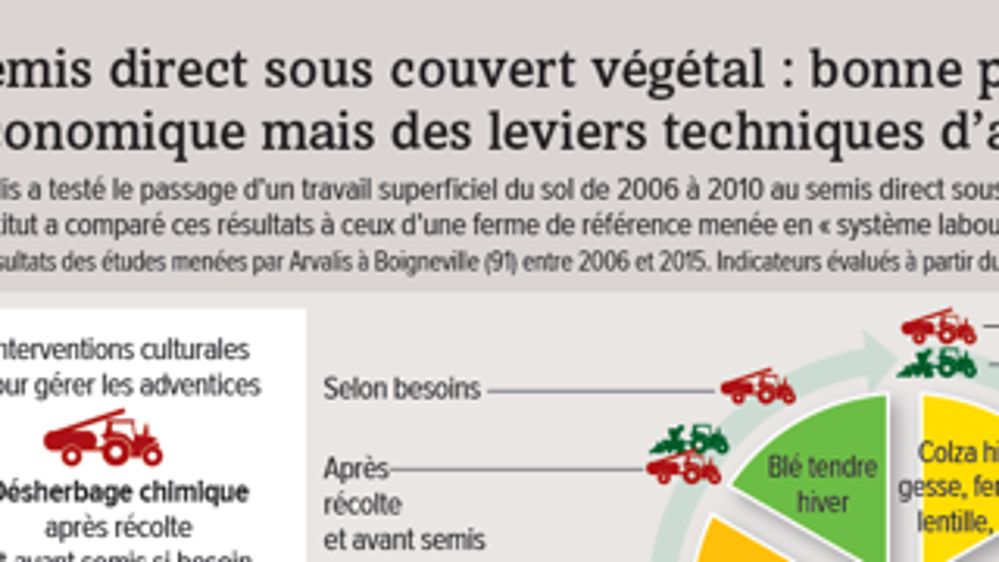 Comme en travail superficiel du sol (TSL), une productivité du travail deux fois plus élevée qu’en système conventionnel reste la clé des bonnes performances économiques d’un système en semis direct sous couvert végétal (SCV). « À valeur de matériel et nombre d’UTH (unité de travail humain) équivalent, les systèmes de travail du sol simplifiés peuvent être déployés sur une surface deux fois plus importante », estime Baptiste Dubois, économiste à Arvalis - Institut du végétal.