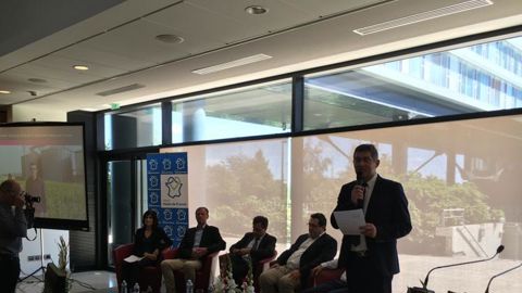Paul Auffray avec les intervenants de la table-ronde (de gauche à droite : Claire Chambolle, Michel Adam, Frédéric Descrozailles, Jacques Mourier). © E. Casalegno/GFA