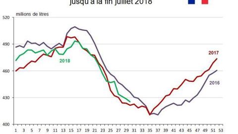 Dans l’Hexagone, les conditions climatiques ne semblent pas, pour l’heure, impacter la production laitière. « Les sondages hebdomadaires de collecte laitière établis par FranceAgriMer qui s’arrêtent à à la fin de juillet (voir ci-dessous) ne montrent pas d’évolution spectaculaire sur les dernières semaines, note Benoît Rouyer. La collecte française reste en légère progression par rapport à l’année précédente. »