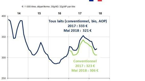 Du côté de la paie de lait, les éleveurs français accusent en mai 2018 un sévère repli par rapport à 2017 (voir ci-dessous). Selon l’enquête mensuelle laitière de FranceAgriMer, le prix standard du lait de vache conventionnel était en mai dernier de 306 €/1 000 l, soit un recul de 17 € par rapport à l’an passé. Tous laits confondus (conventionnel, bio et AOP), cette différence est ramenée à 12 €/1 000 l.