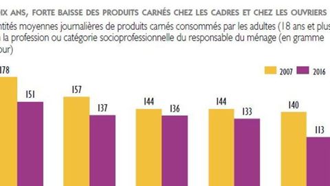 Les plus fortes baisses de consommation de produits carnés ont été enregistrées chez les ménages de cadres et professions libérales (–19 % entre 2007 et 2016) ainsi que chez les ouvriers (–15 %). Chez les ménages d’agriculteurs et d’artisans, la baisse de la consommation a été de 13 %, passant de 157 à 137 g par jour. Ils sont les deuxièmes plus gros consommateurs de viande, après les ouvriers.