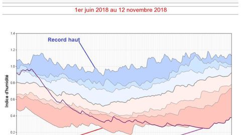 Parmi les zones les plus touchées : la Franche-Comté. Météo-France a publié le 13 novembre 2018 la mesure de l’humidité des sols sur les cinq derniers mois de cette région. Alors que les sols étaient très humides jusqu’à la mi-juin, la quantité d’eau dans le sol chute de manière presque constante depuis jusqu’à atteindre des niveaux historiquement bas à partir d’octobre.