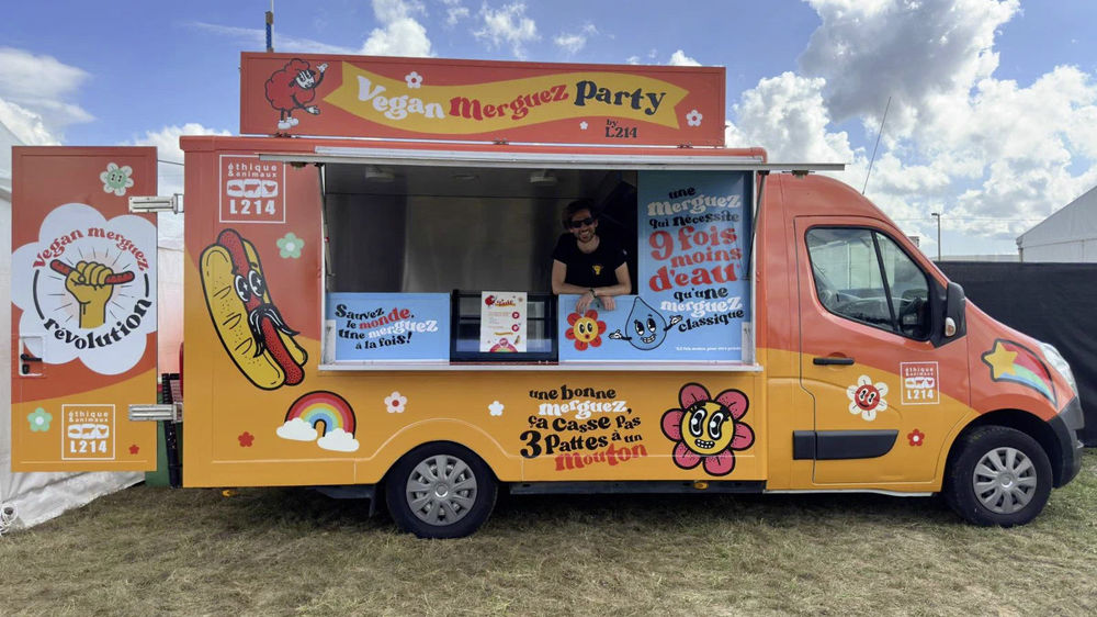 En ce dimanche 17 septembre 2023, troisième jour de fête, le stand de l’association de défense des animaux L214, qui vient pour la première fois à cet évènement, est encore victime de son succès : « Hier, notre service a commencé à 11 h et nos cuisines étaient vides à 13 h 30 », sourit Hugo Bouxom. Le chargé de campagne pour L214 gère le food-truck rouge et jaune appelé « Vegan merguez party ».