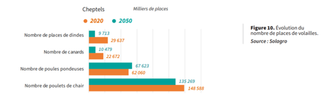 Selon la prospective de Solagro, « le nombre de places de porcs diminuerait par ailleurs de 54 %, et le nombre de porcs abattus par an de 61 % ». Pour les poulets de chair, leur nombre et leur abattage baisseraient respectivement de 18 % et de 53 % par an. En revanche, les poules pondeuses sont les seuls élevages dont les effectifs augmenteraient (+ 9 %).
