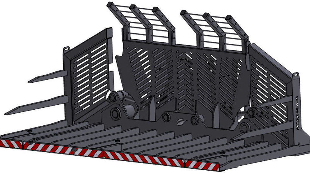 Pour faciliter le transport, le rangement et la gestion des espaces restreints sur les silos, la fourche est dotée de volets latéraux repliables à 90°. Ils sont actionnés par des vérins alimentés par une seule ligne hydraulique à double effet.