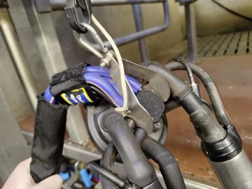 En effet, l’installation vient littéralement se greffer sur chaque manchon. Pour la mise en place, il suffit de couper le tube en caoutchouc et d’y insérer un raccord auquel est rattaché le fameux troisième tuyau de la griffe. Ce dernier est relié au boîtier sous le quai, lui-même raccordé à un réservoir avec une pompe hors de la salle de traite.