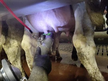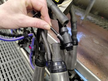 « L’utilisation du système est entièrement automatisée, on ne s’en occupe pas lors de la traite », déclare Catherine. Lorsque la vache a donné son lait et que le décrochage débute, le liquide de posttrempage est projeté dans le manchon, en direction du trayon. Le faisceau remonte alors avec son cordon mais grâce à un crochet situé à son extrémité, place la griffe en haut et les faisceaux trayeurs vers le bas. Le cycle de désinfection commence alors, en débutant par un premier rinçage afin d’évacuer le liquide de post-trempage dans le manchon. « Ensuite, 3 cycles de lavage avec désinfection au peroxyde d’hydrogène se suivent, puis 2 de rinçage, le tout avec de l’air pulsé entre chaque étape ». Le mélange du liquide se fait automatiquement par le boîtier, situé sur le mur sous la bordure du quai. Julien doit simplement remplir les réservoirs à l’entrée de la salle de traite. « Entre le post-trempage et la désinfection automatique, je ne reviendrais pas en arrière. Le système nous fait gagner beaucoup de temps et rend la traite plus agréable. »