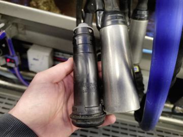 Les griffes situées dans la salle de traite du Gaec sont celles du constructeur, et ne semblent pas différer de leurs homologues. Pourtant, en se rapprochant, on peut voir un troisième tuyau, plus petit, accompagnant ceux pour le vide d’air et la récupération du lait. Au bout de ce tuyau se trouve un boîtier AirWash + AW30. Julien justifie ce choix : « Comme la désinfection était pour nous primordiale, il fallait trouver un système nous faisant gagner du temps. J’ai vu que plusieurs marques proposaient d’automatiser la désinfection, avec en prime le posttrempage. En revanche, je voulais garder les manchons DeLaval. c’est pourquoi nous avons signé opté pour AirWash qui ne change pas les faisceaux trayeurs mais ajoute un kit sur l’existant. »