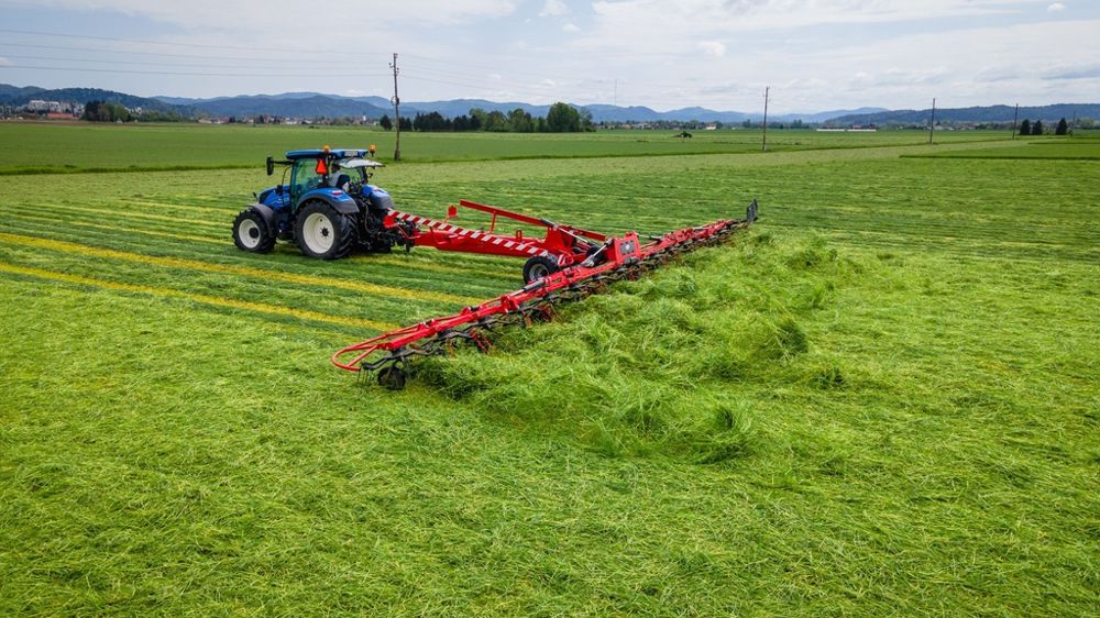 Le constructeur slovène Sip a fait sensation lors de la dernière édition d’Agritechnica avec une faneuse XXL qui dépassait des limites de son stand. La Spider HD est dotée de 16 toupies et travaille sur 17,20 mètres. Cet engin semi-porté dispose d’un point de pivotement plus à l’arrière du chariot. Un indicateur d’inclinaison assure le bon réglage de l’attelage, au travail comme au transport.