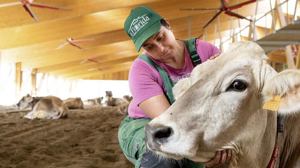 À la ferme de la Fiorida à Mantello (Lombardie) en Italie, les vaches laitières de Viola Vanini ont droit à un traitement spécial. Le bâtiment d’élevage abrite une aire libre sablée de 2 500 m², qui s’étend en longueur sur la moitié du bâtiment. Dans ce spacieux volume, les 120 brunes des Alpes, conduites en intérieur toute l’année ont largement de quoi se coucher confortablement. L’aire sablée est longée par un couloir d’alimentation et des box sablés.