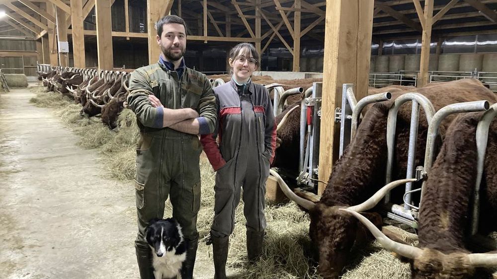 « Nous avons voulu nous donner les moyens de faire vivre le système de nos aïeux avec la vache du pays dans des conditions adaptées à notre époque », expliquent tout sourire Guillaume Rongier et sa compagne et associée, Mathilde Bernard, installés avec 70 vaches salers inscrites et 116 ha tout en herbe, à Moussages dans le Cantal.