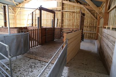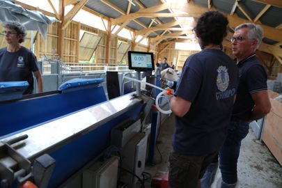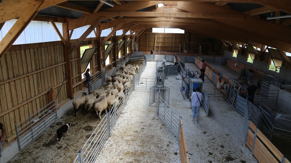 « Nous avons intégré la salle de tonte dans l’espace, ajoute Mickaël Bernard. Le poste de tonte est de plain-pied avec le reste du bâtiment. Une fois la tonte terminée, l’animal glisse sous la plateforme de travail. Il remonte dans le bâtiment par une pente aménagée. »