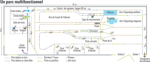 Les concepteurs ont privilégié une circulation fluide des animaux et des hommes tout en abandonnant le « camembert » qui constituait le cœur de l’aménagement précédent. « Les animaux peuvent rejoindre par lots, les différents couloirs réservés à des traitements spécifiques grâce à un système de barrières », explique Mickaël Bernard, le directeur adjoint du Ciirpo. Parmi les équipements présents, la cage de contention surélevée avec une porte-cornadis est utilisée lors des échographies.