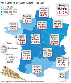 Malgré de meilleurs rendements qu’en 2024 (à 57,6 q/ha en 2025 contre 51,7 q/ha), la production de blé dur n’augmenterait que légèrement en 2025, pénalisée par des surfaces en baisse (222 000 hectares contre 240 000 l’an passé). La récolte s’établit à 1,3 million de tonnes, en hausse de 3,3 % sur un an, mais en retrait de 6,1 % par rapport à la moyenne quinquennale.