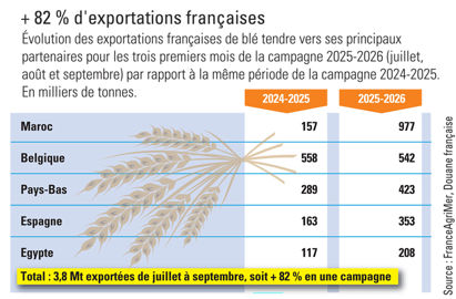 Preuve du commerce dynamique, concernant les exportations françaises de blé sur le cumul juillet septembre 2025, on note une progression de 82 % par rapport à la même période lors de la campagne passée (et + 9 % par rapport à la moyenne quinquennale), à 3,8 millions de tonnes. Le Maroc est le premier débouché (0,977 million de tonnes, contre seulement 0,157 million de tonnes la campagne passée), suivi de la Belgique, des Pays-Bas, de l’Espagne et de l’Égypte. Sur toute la campagne, les exportations sont estimées à près de 15 millions de tonnes (dont plus de la moitié à destination des pays tiers), contre 10,4 millions de tonnes l’an passé, soit une hausse de 44 % en un an.
