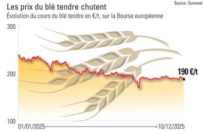 Les prix en revanche tendent à la baisse depuis un an. L’Association générale des producteurs de blé s’inquiétait fin octobre : « Avec un prix payé aux céréaliers de 160 €/t alors que leurs coûts de production dépassent 230 €/t, c’est 70 €/t qui manquent pour atteindre l’équilibre. »