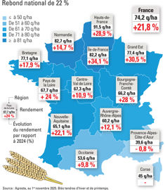 Cette année, la récolte du blé tendre s’est achevée en avance, fin juillet, dans de meilleures conditions qu’en 2024. La production de 2025 est estimée à 33,3 millions de tonnes (Mt), en hausse de 29,8 % par rapport à la campagne passée, année noire, et de 4,7 % par rapport à la moyenne quinquennale 2020-2024 (dont deux années faibles : 2020 et 2024). Ces hausses sont le fruit d’un rendement en forte progression : 74,2 quintaux par hectare contre 60,9 quintaux par hectare en 2024. Dans une moindre mesure, les surfaces ont également connu une augmentation, à 4,5 millions d'hectares, contre 4,2 millions d'hectares en 2024.
