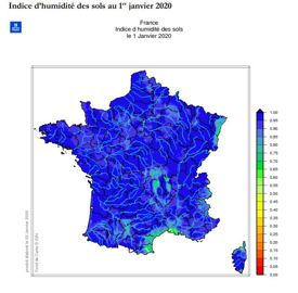Au 1er janvier, l’indice d’humidité des sols superficiels est supérieur à la normale sur la quasi-totalité du pays. L’excédent est localement supérieur à 20 % sur le Bassin parisien, dans les Pays de la Loire et le nord du Poitou, du Lot-et-Garonne et du Gers à l’Aude, sur les côtes du Roussillon ainsi qu’en Région Paca. Il atteint ponctuellement 40 à 60 % dans les Bouches-du-Rhône et sur l’est des Pyrénées.