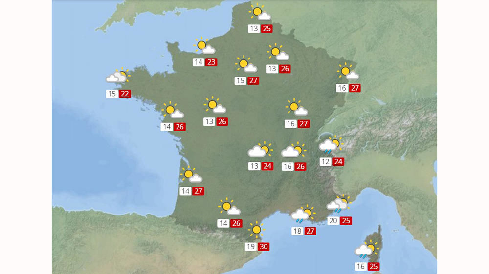 Cette situation se répétera jusqu’à jeudi au moins, selon l’organisme de prévisions météorologiques, avec « localement [un temps] instable ou orageux près des reliefs de l’Est essentiellement […], mais avec aussi une chaleur qui prendra de l’ampleur au fil des jours. » Les températures approcheront les 30°C, avec des pointes à 35°C dans le Sud-Ouest ou en Provence.