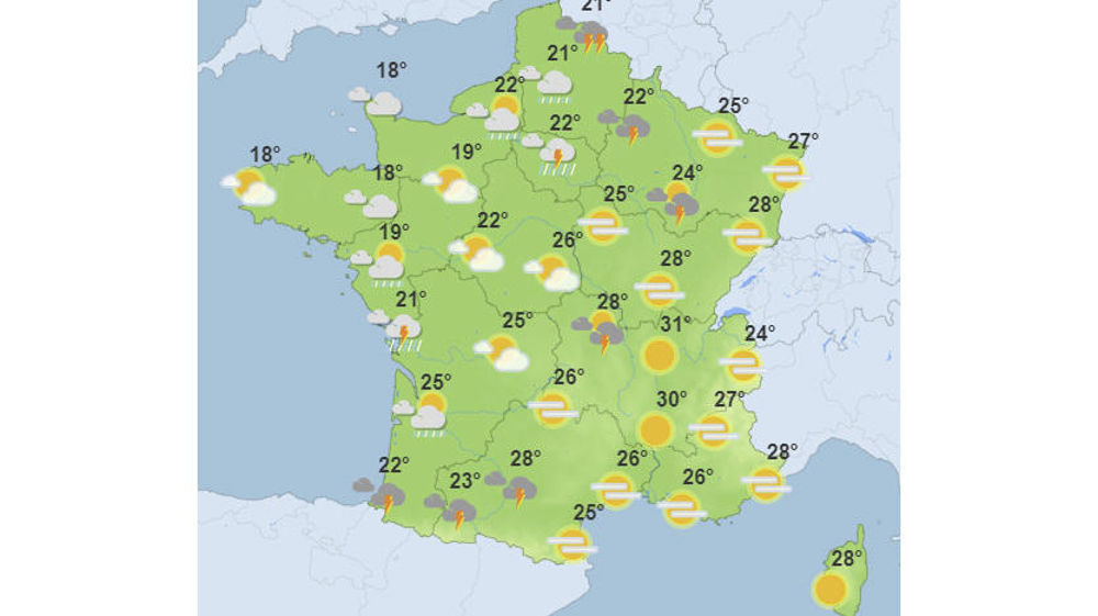 Les températures, souvent en hausse samedi 31 août, resteront généralement au-dessus des moyennes saisonnières. On pourra par exemple dépasser encore les 30°C en Île-de-France, notamment dimanche.