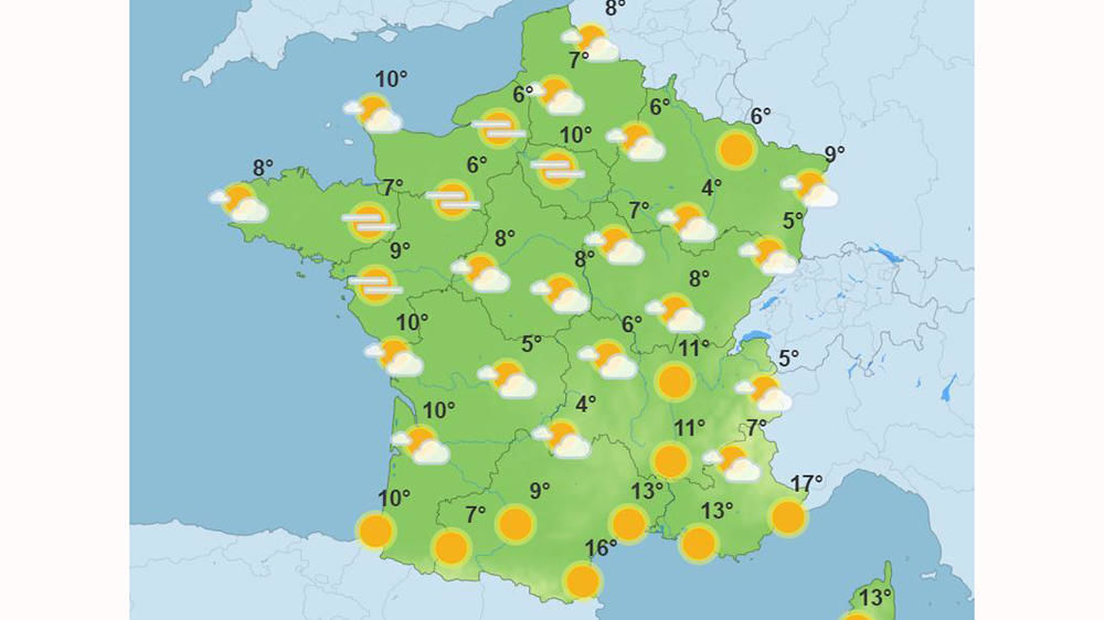 Le temps s’annonce ensoleillé et frais pour le week-end, avec des températures qui remontent lentement. Néanmoins, la matinée de samedi « sera la plus froide de la semaine avec de possibles gelées très localisées dans les “trous à froid” entre l’Auvergne et le Nord-Est ».