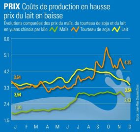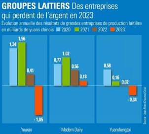 « Entre 2018 et 2023, la production laitière a bondi de 36 %. Résultat, le pays produit trop de lait », explique Jean-Marc Chaumet. Problème, la consommation ne suit pas. « Le pays traverse une situation économique préoccupante », note le spécialiste. La politique du « zéro Covid » et les confinements successifs ont impacté à la baisse la consommation de produits laitiers en 2022 et 2023. Contrairement au reste du monde, il n’y a pas d’inflation en Chine. Conséquence, le prix du lait est en baisse depuis 2021 et passe même en dessous du prix français en 2023, alors qu’il est d’ordinaire plus élevé. Parce qu’il se combine à des coûts de production en hausse (maïs, tourteau de soja…), 60 % des fermes perdent de l’argent en 2023. Le pays assiste ainsi à des scènes de lait versé ou à des abattages de cheptel.